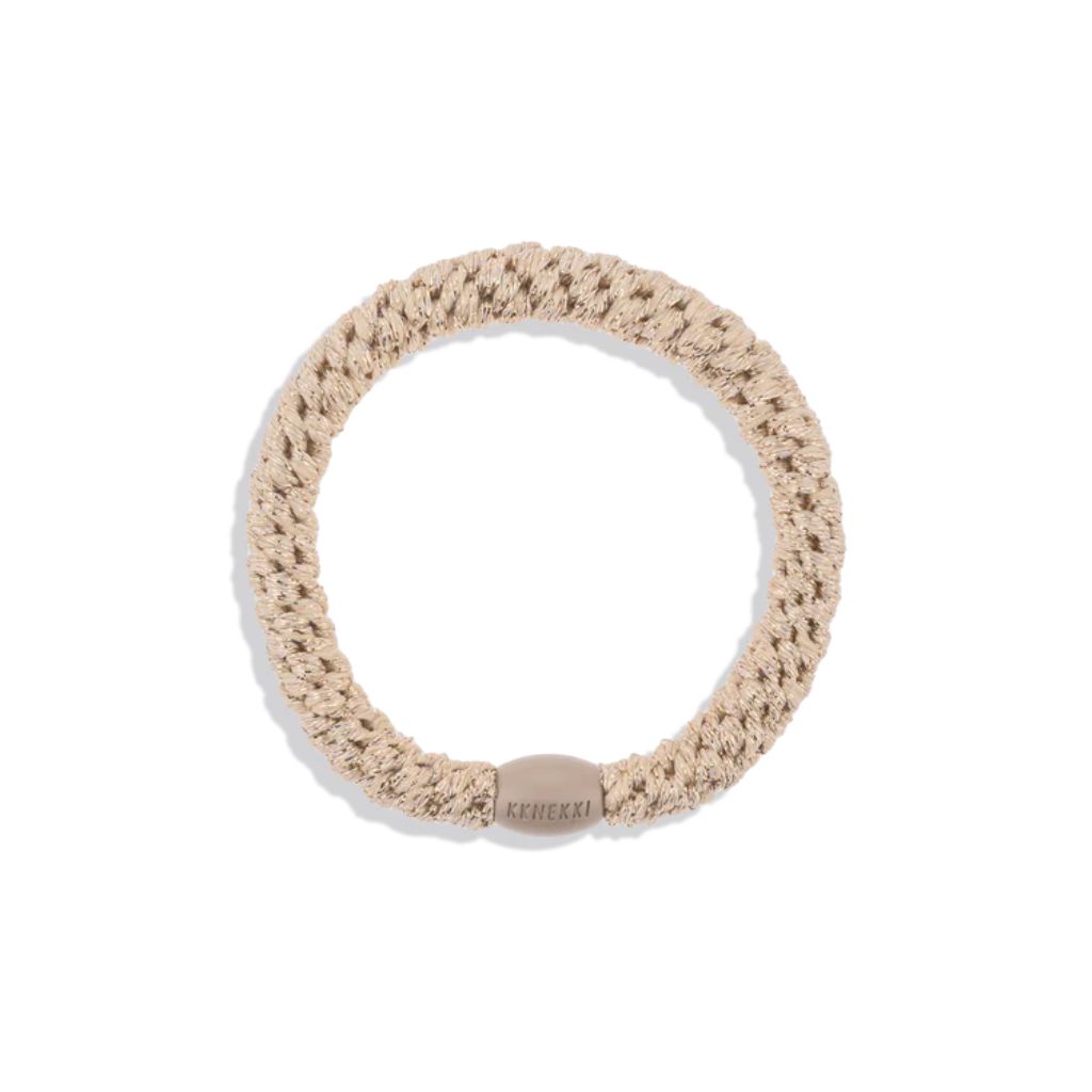Haargummi in beige-glitter mit brauner Perle.