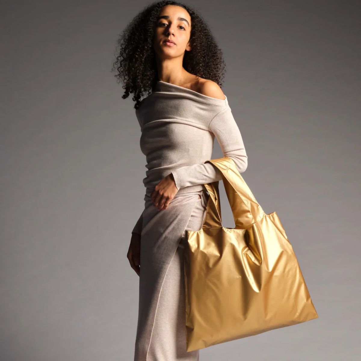 Glamouröses Gold. Erleben Sie die Magie von Metallic mit dieser atemberaubenden Tragetasche. Sie ist aus einem glänzenden, biegsamen Material gefertigt, das sich weich anfühlt und jedem Moment Glamour verleiht. Egal, ob Sie Wertsachen oder Wertgegenstände transportieren, diese Tasche mit Superkraft verleiht jedem Ensemble einen Hauch von Chic.